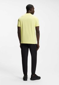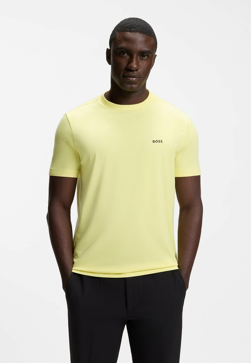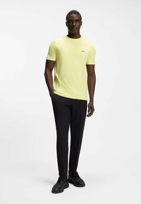 Άνδρας που στέκεται με τα χέρια στις τσέπες φορώντας κίτρινη κοντομάνικη μπλούζα με το λογότυπο "BOSS" και μαύρο παντελόνι, μπροστά σε λευκό φόντο.