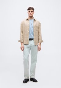 Νεαρός άνδρας που φοράει ανοιχτό μπλε μπλουζάκι BOSS, ανοιχτόχρωμα τζιν με μαύρη ζώνη και ασημένιο κολιέ με μενταγιόν, στέκεται μπροστά σε λευκό φόντο.