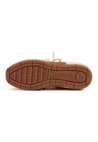 Μπεζ σουέτ αθλητικά παπούτσια με ανοιχτό μπλε λεπτομέρειες, στρογγυλή μύτη και κρέμ κορδόνια. Φορεμένα με λευκές ριγωτές κάλτσες, με καφέ λαστιχένια σόλα.