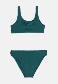 Πράσινο-μπλε ριμπ πλεχτό μαγιό δύο τεμαχίων με αθλητικό τοπ με στρογγυλή λαιμόκοψη και ταιριαστό μαγιό μέσης σε λευκό φόντο.