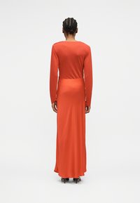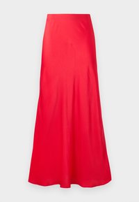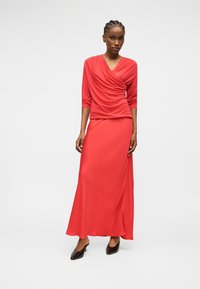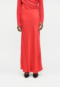 Γυναίκα που φοράει μακριά, ρέουσα κόκκινη φούστα με ένα ταίριαστο κόκκινο μπλουζάκι μακρυμάνικο και μυτερά μαύρα παπούτσια, όρθια μπροστά σε απλό φόντο.