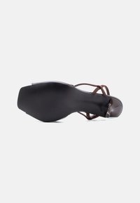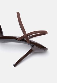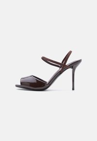 Καφέ πέδιλο με τακούνι από γυαλιστερό δέρμα, ανοιχτό στο μπροστινό μέρος, με διπλά λεπτά λουράκια στον αστράγαλο, σε λευκό φόντο.