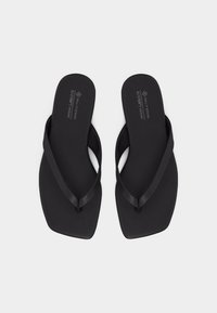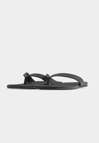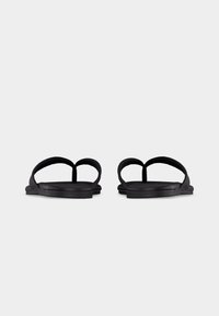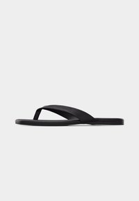 Μονή μαύρη παντόφλα τύπου σαγιονάρα πάνω σε μπλε χαλί με υφή, με θολό στρογγυλεμένο καναπέ στο φόντο.