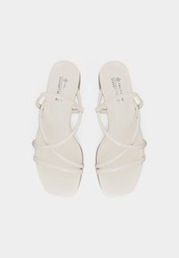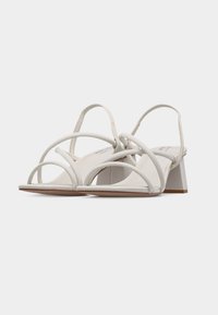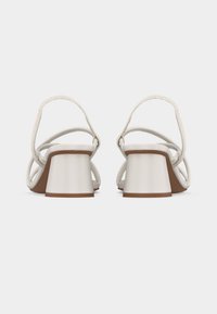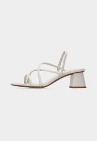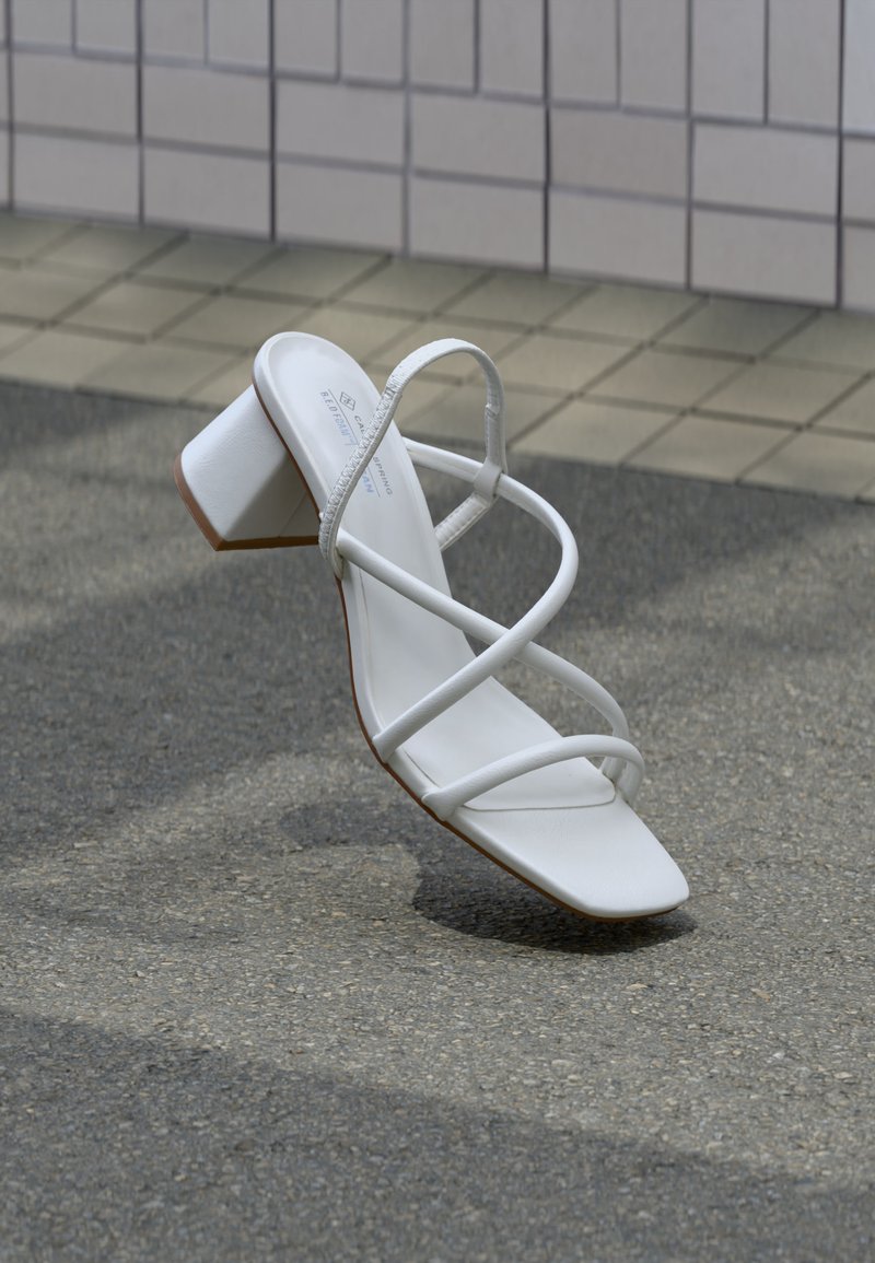 Λευκό σανδάλι με λουριά και τακούνι, με τετράγωνη μύτη και χοντρό τακούνι, πάνω σε ασφαλτοστρωμένη επιφάνεια κοντά σε τοιχο με πλακάκια.