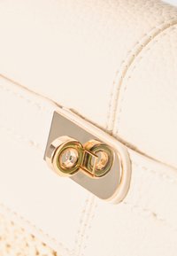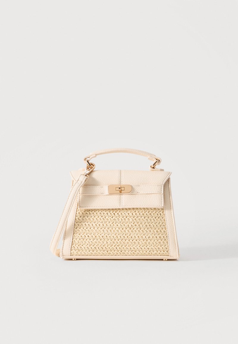 Μπεζ τσάντα χειρός με μπροστινή επιφάνεια υφασμένη από άχυρο, χειρολαβή στην κορυφή, χρυσό κούμπωμα και αποσπώμενο λουράκι ώμου σε απλό φόντο.
