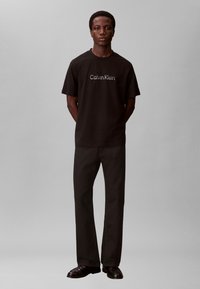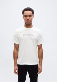 Λευκό βαμβακερό T-shirt με λογότυπο "Calvin Klein" σε γκρι στο μπροστινό μέρος, φορεμένο με μαύρο τζιν και μαύρη ζώνη, με κοντά μανίκια και στρογγυλή λαιμόκοψη.