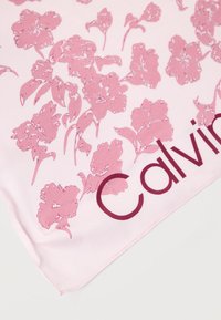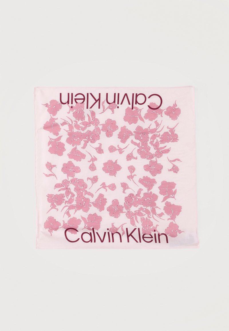Φουλάρι τετράγωνο ανοιχτό ροζ με διασκορπισμένο σκουρότερο ροζ λουλουδάτο μοτίβο και το κείμενο «Calvin Klein» κατά μήκος δύο άκρων.