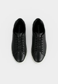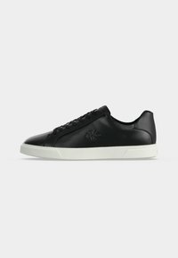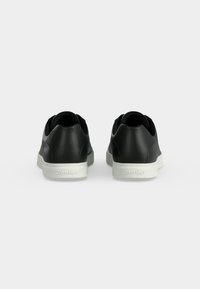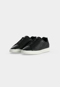 Μαύρο sneaker χαμηλής κοπής με λευκή σόλα, κορδόνια και ανάγλυφο λογότυπο, εμφανίζεται με φόντο από γυάλινες πλάκες και κολώνες από σκυρόδεμα.