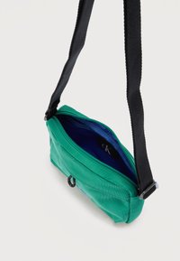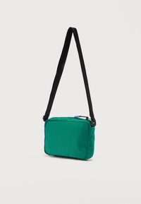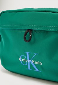 Μικρή πράσινη τσάντα χιαστί με μαύρο ρυθμιζόμενο λουράκι, μπροστινή τσέπη με φερμουάρ και μπλε λογότυπο Calvin Klein σε λευκό φόντο.