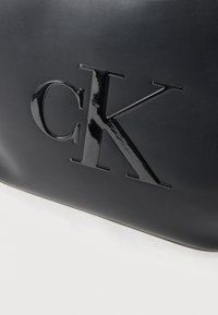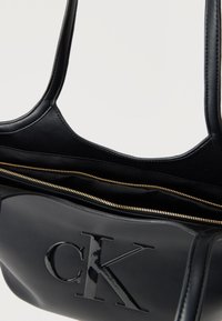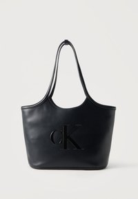 Μαύρη τσάντα tote από δέρμα με διπλές μακριές λαβές και ανάγλυφο λογότυπο CK στο μπροστινό μέρος, πάνω σε απλό φόντο.