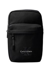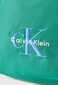 Πράσινο τσάντα Calvin Klein χιαστί με μπροστινή τσέπη με φερμουάρ και ρυθμιζόμενο μαύρο λουρί πάνω σε απλό φωτεινό φόντο.