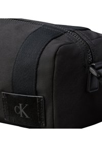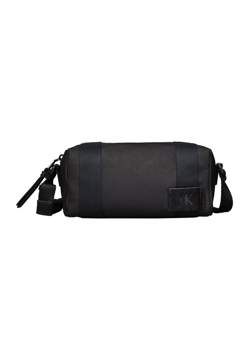 Μικρή μαύρη κυλινδρική τσαντάκι καλλυντικών με ρυθμιζόμενο λουράκι και λογότυπο Calvin Klein σε εμπρόσθιο πλαίσιο.