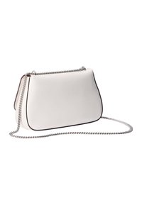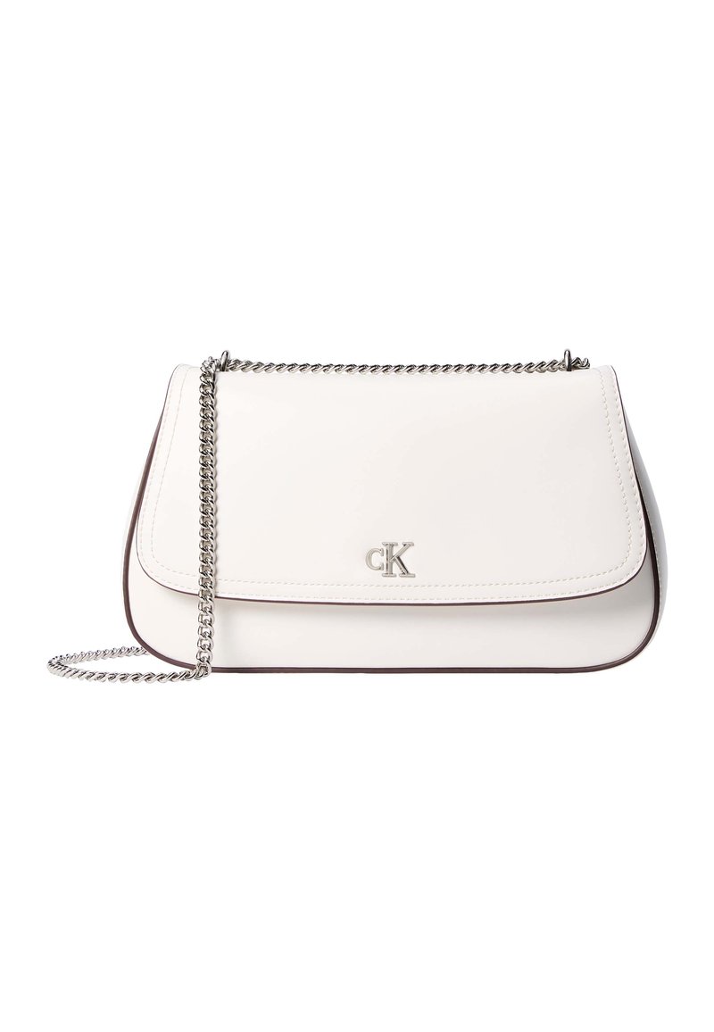 Λευκή δερμάτινη τσάντα ώμου με ασημένια αλυσίδα λουράκι και μικρό λογότυπο "cK" στην μπροστινή πλευρά.