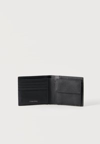 Μαύρο δερμάτινο δίπτυχο πορτοφόλι με υφή και ασημένια πλάκα λογοτύπου Calvin Klein στη δεξιά κάτω γωνία.