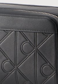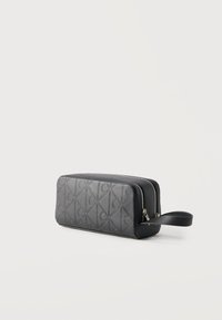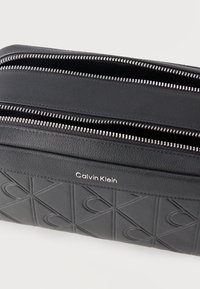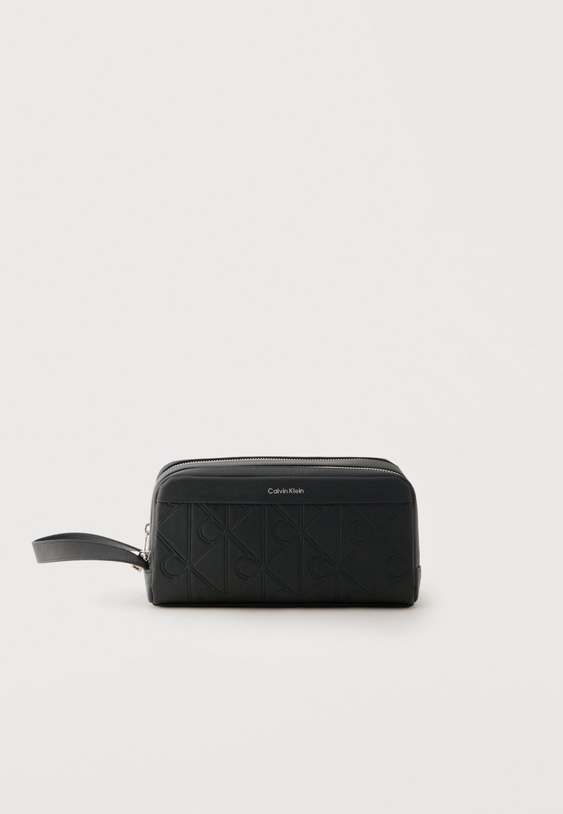 Μαύρο ορθογώνιο νεσεσέρ Calvin Klein με ανάγλυφο μοτίβο λογότυπου και ιμάντα μεταφοράς στο πλάι, τοποθετημένο σε απλό λευκό φόντο.