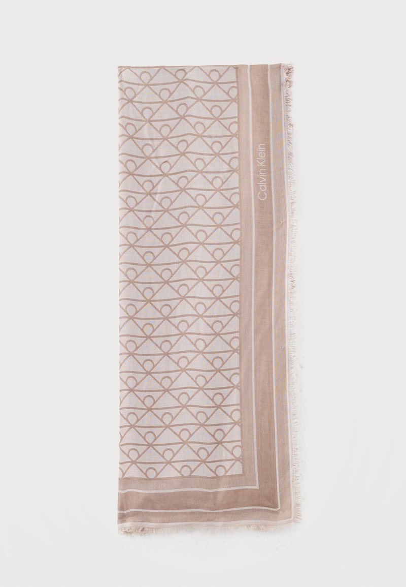 Μπεζ και λευκό φουλάρι με ορθογώνιο σχήμα, διακοσμημένο με γεωμετρικούς βρόχους και περιμετρικό σχέδιο, με την επωνυμία "Calvin Klein" σε μια άκρη.