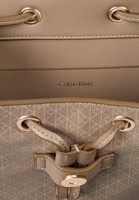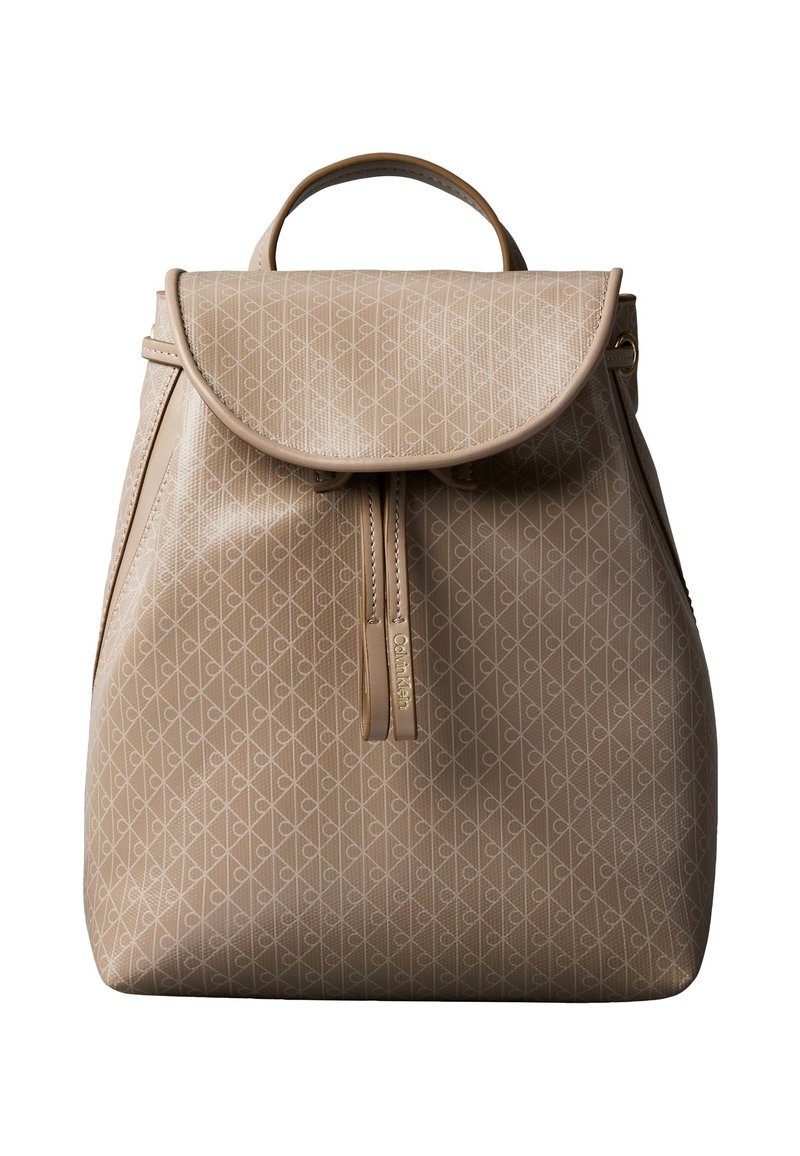 Μπεζ σακίδιο με κλείσιμο με καπάκι, διακριτικό γεωμετρικό μοτίβο, χειρολαβή στο πάνω μέρος και λογότυπο Calvin Klein στο μπροστινό σκοινί.