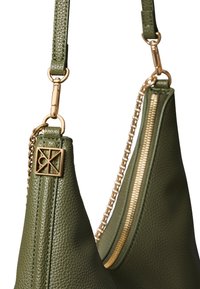 Πράσινη ελιά δερμάτινη τσάντα ώμου με ρυθμιζόμενη λωρίδα και διακοσμητική χρυσή αλυσίδα, λογότυπο Calvin Klein στο κέντρο μπροστά.