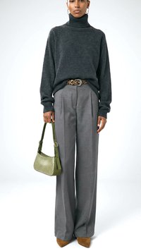 Γυναίκα που φοράει σκούρο γκρι πουλόβερ με λαιμόκοψη, φαρδιά γκρι παντελόνια, καφέ μυτερά παπούτσια, ζώνη με λεοπαρ σχέδιο, κρατώντας πράσινη τσάντα, στέκεται μπροστά σε λευκό φόντο.
