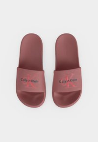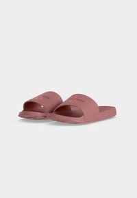 Ροζ σαγιονάρα Calvin Klein αιωρείται πάνω από ξύλινη και χαλικώδη εξωτερική επιφάνεια με φυλλωσιά και φόντο από σκυρόδεμα.