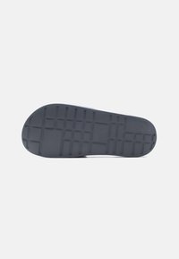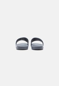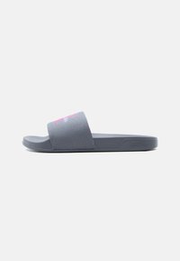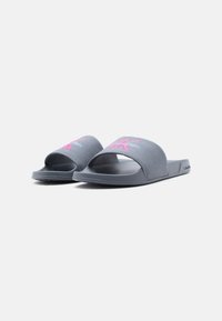 Γκρι σανδάλι slide με ροζ και λευκό λογότυπο σε υφασμάτινο λουράκι, επίπεδη σόλα και το ανάγλυφο γράμμα «Calvin Klein» στο πλάι.