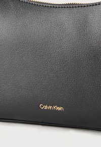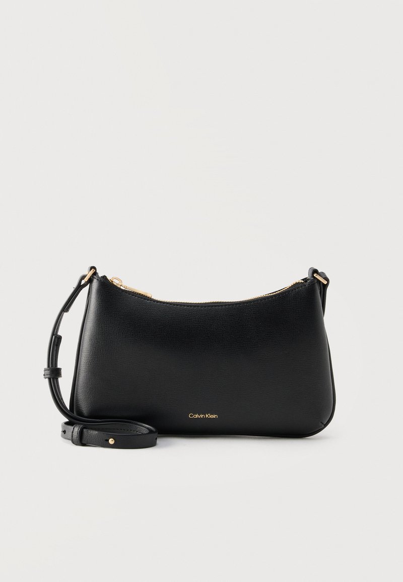 Μαύρη δερμάτινη τσάντα ώμου Calvin Klein με χρυστό φερμουάρ και ρυθμιζόμενο λουράκι σε απλό φωτεινό φόντο.