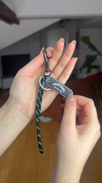 Μαύρο πλεγμένο μπρελόκ με πράσινες λεπτομέρειες, μεταλλικό κλιπ και κυκλικό κρίκο με ορθογώνια ετικέτα. Λεπτομέρειες υφής στην επιφάνεια.
