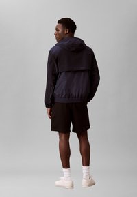 Νέος άνδρας με σκούφο με κουκούλα, μαύρα σορτς Calvin Klein, λευκές κάλτσες και λευκά αθλητικά παπούτσια, στέκεται μπροστά σε απλό γκρι φόντο.