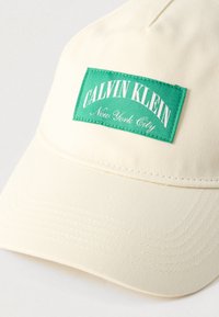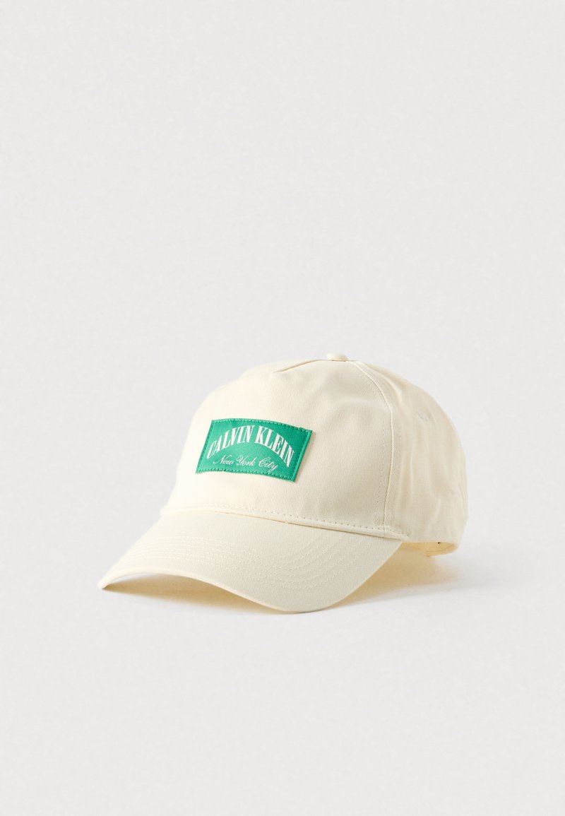 Καπέλο ανοιχτό μπεζ από βαμβάκι, με πράσινο ορθογώνιο έμπλαστρο που φέρει το κείμενο "CALVIN KLEIN" και "New York City". Καμπυλωτό γείσο.