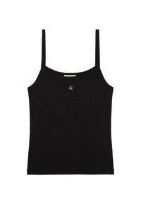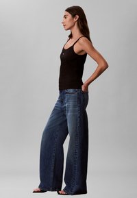 Γυναίκα με μακριά καστανά μαλλιά που φοράει μαύρη αμάνικη μπλούζα Calvin Klein και μπλε τζιν, όρθια με τα χέρια στις τσέπες μπροστά σε γκρίζο φόντο.