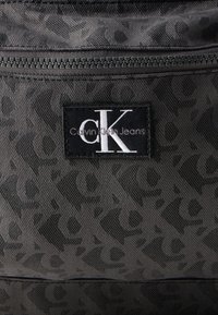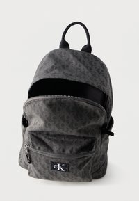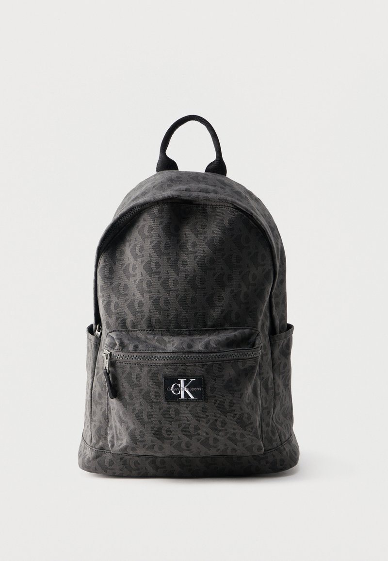 Σκούρο γκρι σακίδιο πλάτης Calvin Klein με επαναλαμβανόμενο μοτίβο "ck", εμπρόσθια τσέπη με φερμουάρ και επάνω λαβή σε λευκό φόντο.