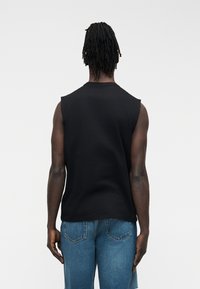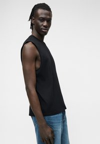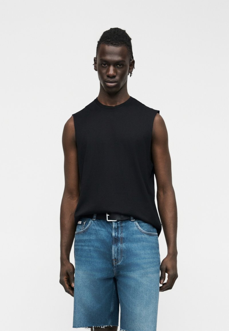 Νεαρός άνδρας με σκουρόχρωμο δέρμα, φορώντας μαύρο αμάνικο μπλουζάκι και μπλε κοντό τζιν, στέκεται μπροστά σε απλό φωτεινό φόντο.