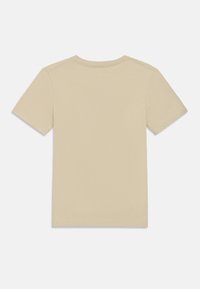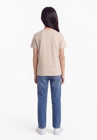 Νέος με μακριά σκούρα μαλλιά, φορώντας μπεζ μπλουζάκι Calvin Klein, μπλε τζιν και λευκά αθλητικά παπούτσια, στέκεται μπροστά σε άσπρο φόντο.