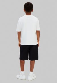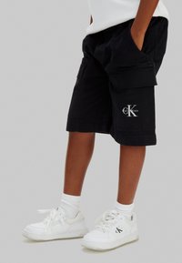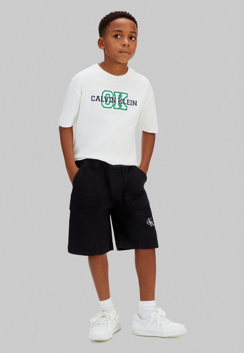 Νέος αγόρι στέκεται με τα χέρια στις τσέπες, φοράει άσπρο T-shirt Calvin Klein, μαύρα cargo σορτς, άσπρες κάλτσες και λευκά αθλητικά, σε γκρι φόντο.