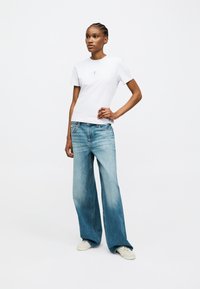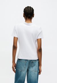 Γυναίκα με κοτσίδα, που φοράει λευκό t-shirt με το λογότυπο Calvin Klein και μπλε τζιν, στέκεται με το ένα χέρι στην τσέπη μπροστά σε απλό φόντο.