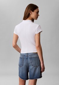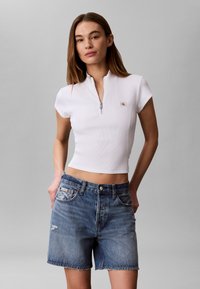 Γυναίκα φοράει λευκό crop top με κοντά μανίκια και φερμουάρ και μπλε τζιν σορτς με τα χέρια στις τσέπες μπροστά σε απλό γκρι φόντο.