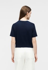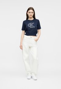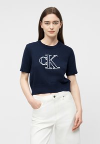 Νεαρή γυναίκα με μακριά καστανά μαλλιά, που φοράει μπλε σκούρο κοντομάνικο πουλόβερ με λευκό λογότυπο «cK» και λευκό παντελόνι ψηλής μέσης, όρθια.
