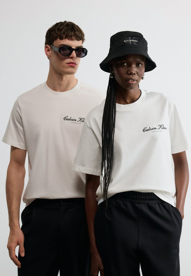 Δύο μοντέλα φορούν λευκά t-shirts Calvin Klein και μαύρο παντελόνι, το ένα με γυαλιά ηλίου και το άλλο με μαύρο καπέλο bucket Calvin Klein.