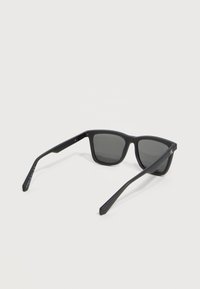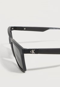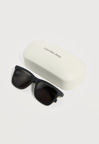 Μαύρα ορθογώνια γυαλιά ηλίου Calvin Klein με σκούρους φακούς, που ακουμπούν σε μια ανοιχτή επιφάνεια, ελαφρώς γυρισμένα προς τα δεξιά.