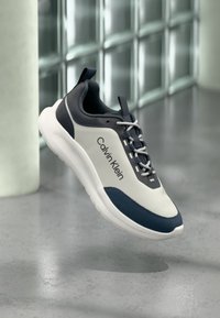 Αθλητικό παπούτσι Calvin Klein σε ανοιχτό γκρι και ναυτικό μπλε με λευκή σόλα και κορδόνια, που αιωρείται πάνω από ένα γυαλισμένο τσιμεντένιο δάπεδο, με γυάλινο τοίχο στο φόντο.