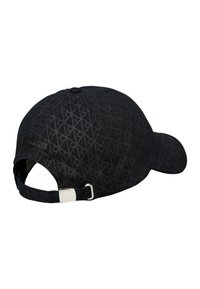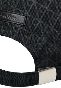 Άνδρας που φορά μαύρο καπέλο με σχέδιο και μαύρο μπουφάν με φερμουάρ, κοιτώντας ελαφρώς στο πλάι, με φόντο ένα απλό γκρίζο.