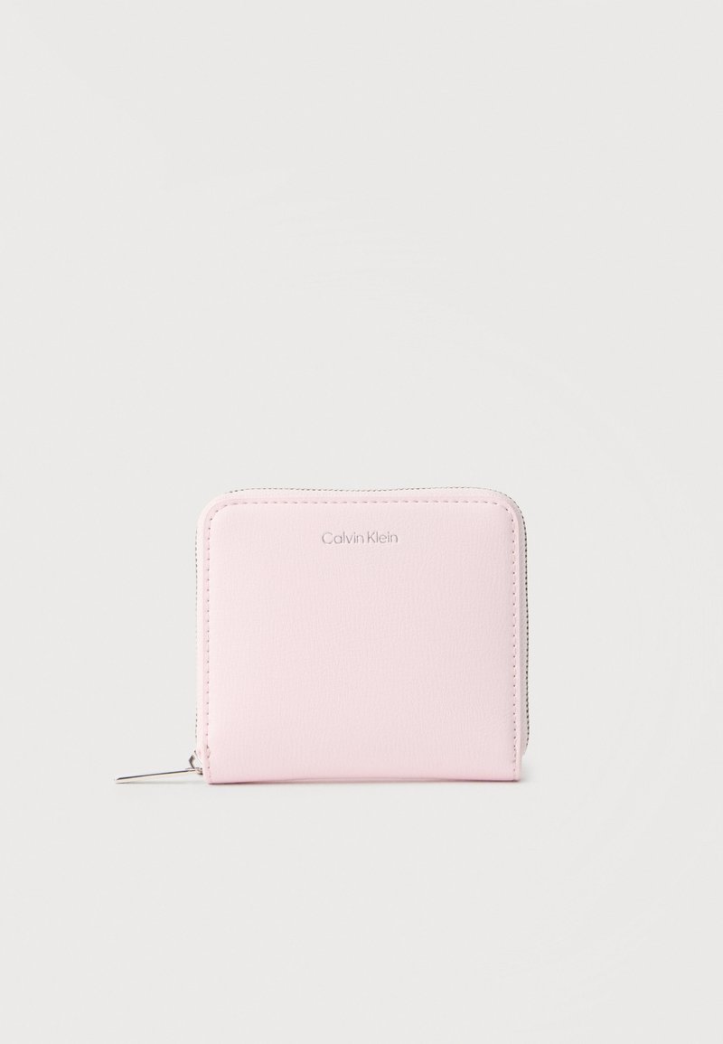Πορτοφόλι Calvin Klein σε ανοιχτό ροζ χρώμα με φερμουάρ και διακριτικό λογότυπο στο μπροστινό μέρος, σε ουδέτερο φόντο.