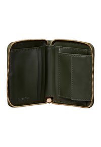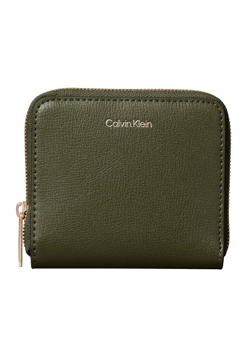 Συμπαγές πορτοφόλι από δέρμα σε ελιά πράσινο χρώμα με χρυσό φερμουάρ και ανάγλυφο το λογότυπο Calvin Klein στο εμπρόσθιο μέρος.