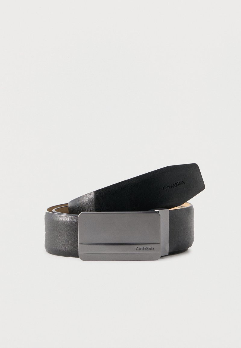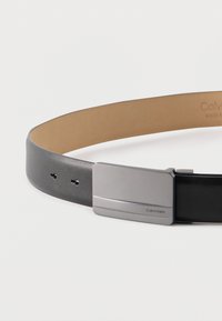 Μαύρη δερμάτινη ζώνη τυλιγμένη με ματ ασημένια ορθογώνια αγκράφα, με το λογότυπο Calvin Klein χαραγμένο στην αγκράφα και την άκρη της ζώνης.