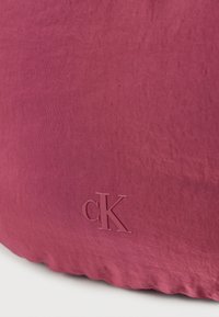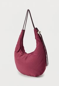 Τσάντα hobo σε μπορντό χρώμα με μαλακό, υφασμάτινο υλικό, μια καμπυλωτή λαβή και κλείσιμο με φερμουάρ που τονίζεται από ένα μεταλλικό χάντρα.
