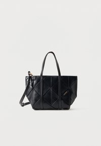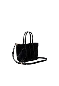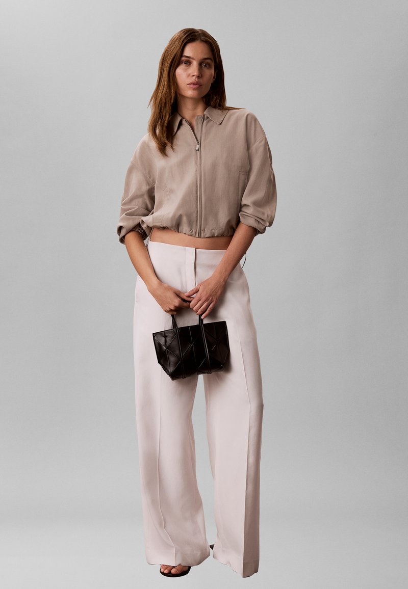 Γυναίκα που στέκεται φορώντας μπεζ κοντό μπουφάν με φερμουάρ, φαρδιά ανοιχτό ροζ παντελόνια, κρατώντας μικρή μαύρη καπιτονέ τσάντα με χερούλια.