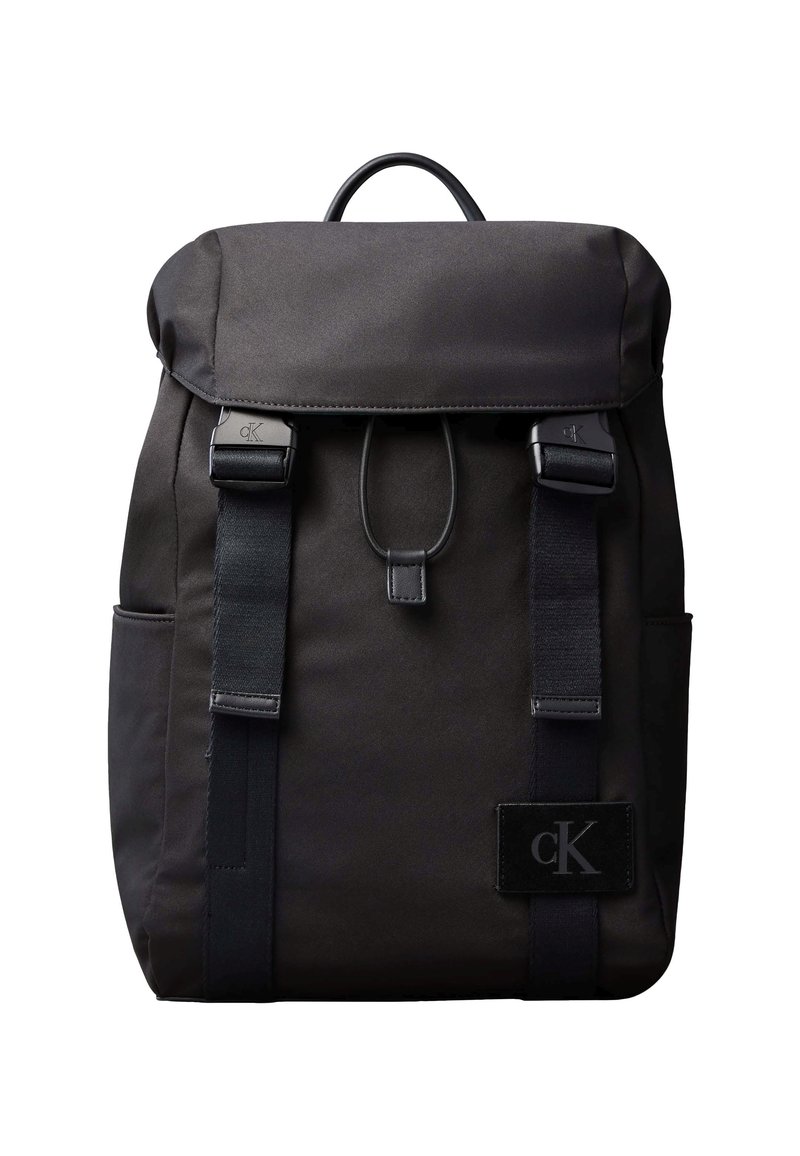 Μαύρο σακίδιο πλάτης Calvin Klein με κλείσιμο με καπάκι, δύο μπροστινές λουρίδες με αγκράφες, πλαϊνές τσέπες και επάνω λαβή.