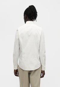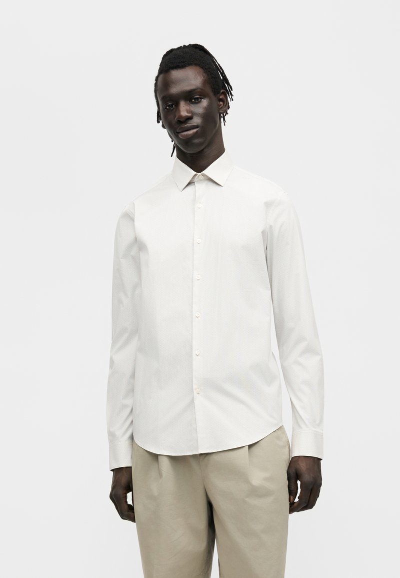 Άνδρας στέκεται με το πρόσωπο προς τα εμπρός, φοράει άσπρο πουκάμισο με μακριά μανίκια και μπεζ παντελόνι μπροστά σε απλό λευκό φόντο.