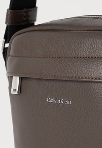 Σκούρο καφέ τσάντα χιαστί από δερμα με υφή, με ρυθμιζόμενο μαύρο λουρί και μικρό λογότυπο Calvin Klein στην μπροστινή τσέπη.