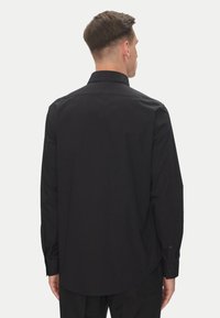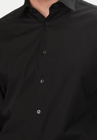Μαύρο πουκάμισο από απαλό ύφασμα, με κλασικό γιακά, κλείσιμο με κουμπιά μπροστά και μακριά μανίκια. Σχεδιασμένο με εφαρμοστή γραμμή.